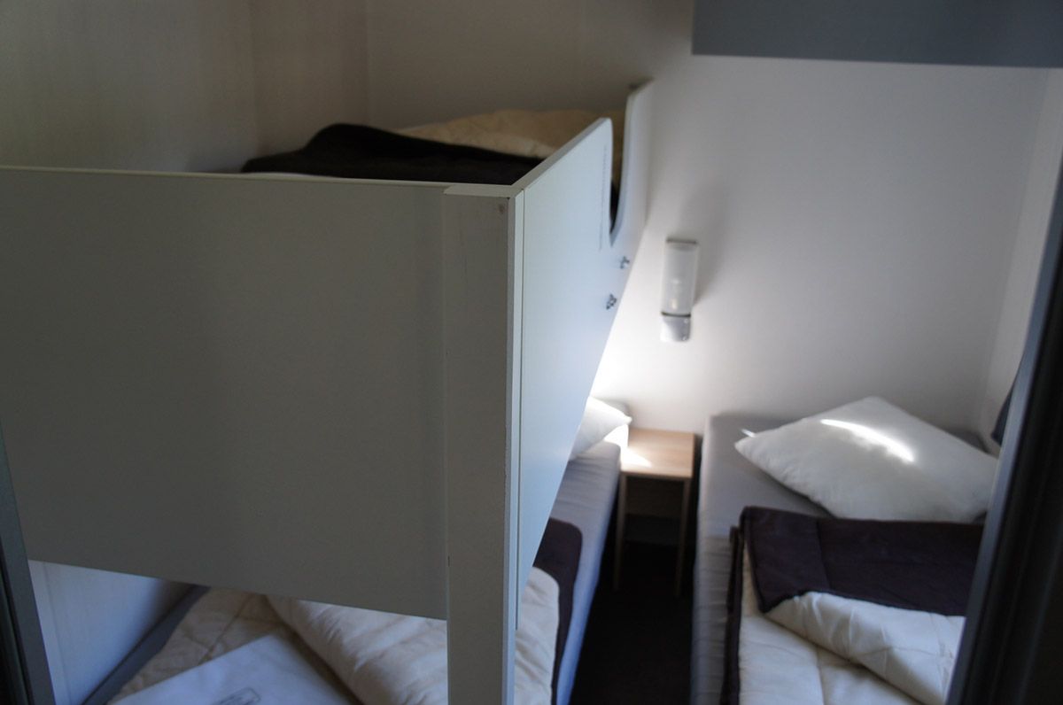 - 1 slaapkamer met 2 bedden naast elkaar + 1 stapelbed (90 cm)