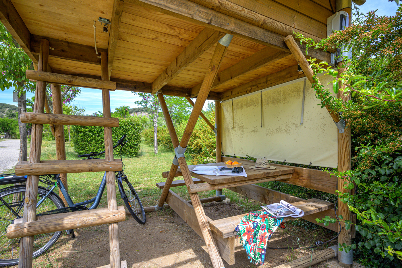 - Staanplaats voor 1 voertuig aan de voorzijde van de tent